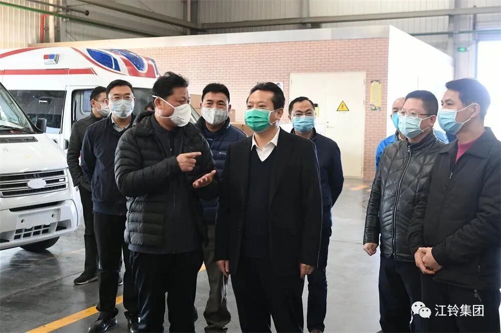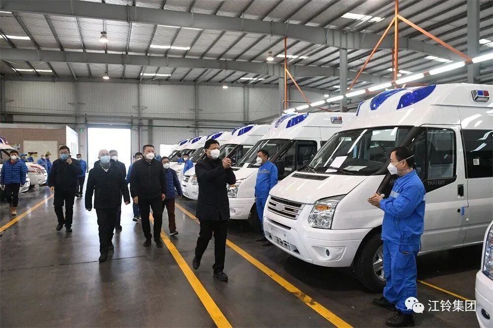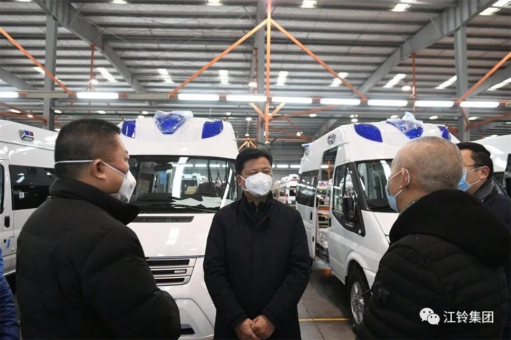 1月27日,农历正月初三,江铃集团党委书记、董事长邱天高率公司应对疫情领导小组成员走访江铃汽车股份有限公司、江铃汽车集团改装车股份有限公司,看望放弃春节休假、奋战一线的干部员工,了解救护车尤其是负压监护型救护车生产进度。在江铃集团改装车公司救护车生产车间,刚刚开完晨会的员工们迎来了大年三十以来的第四个工作日。邱天高一行向大家致以新春的问候,对他们的辛勤付出表示感谢。自新型冠状病毒疫情发生后,江铃集团已接到超过1300台救护车订单,首批32辆用于肺炎转运救治的负压监护型救护车将于29日陆续交付,驶上疫情防控一线。“大战当前,我们要做战士;非常时期,我们要采取非常举措。”邱天高强调,当前疫情愈发严峻复杂,这是一场关系到人民群众生命健康的硬仗。我们要勇于担当、迅速决断,克服影响救护车生产的各种困难,全力以赴确保救护车高质量交付。